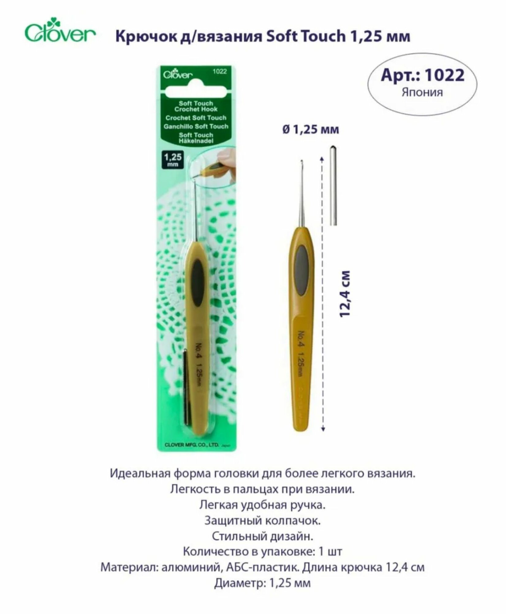 Крючок для вязания Clover Soft Touch, 1,25 мм
