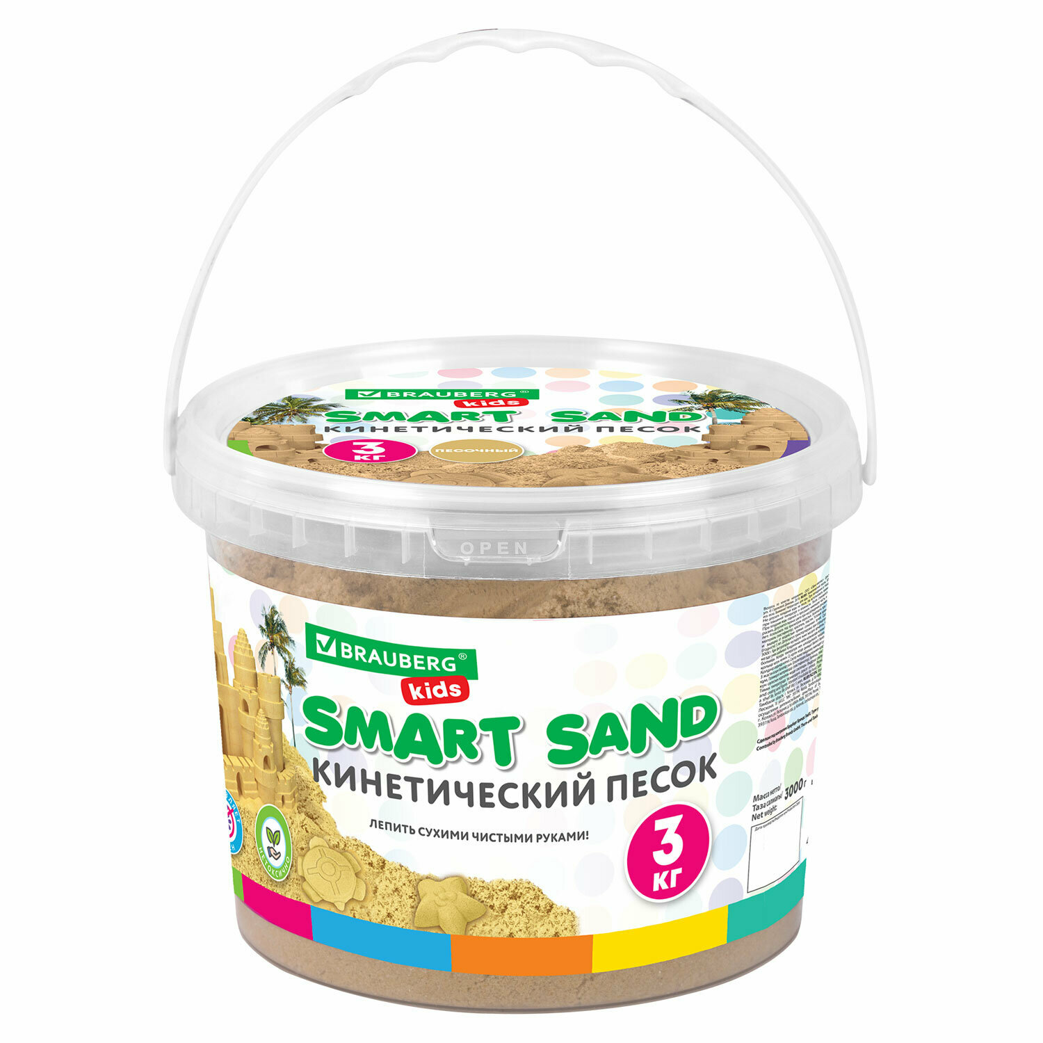 Кинетический песок для детей и малышей набор 3 кг с 3 формочками, лопатка грабли ведро для лепки, песочный, Brauberg Kids, 665480