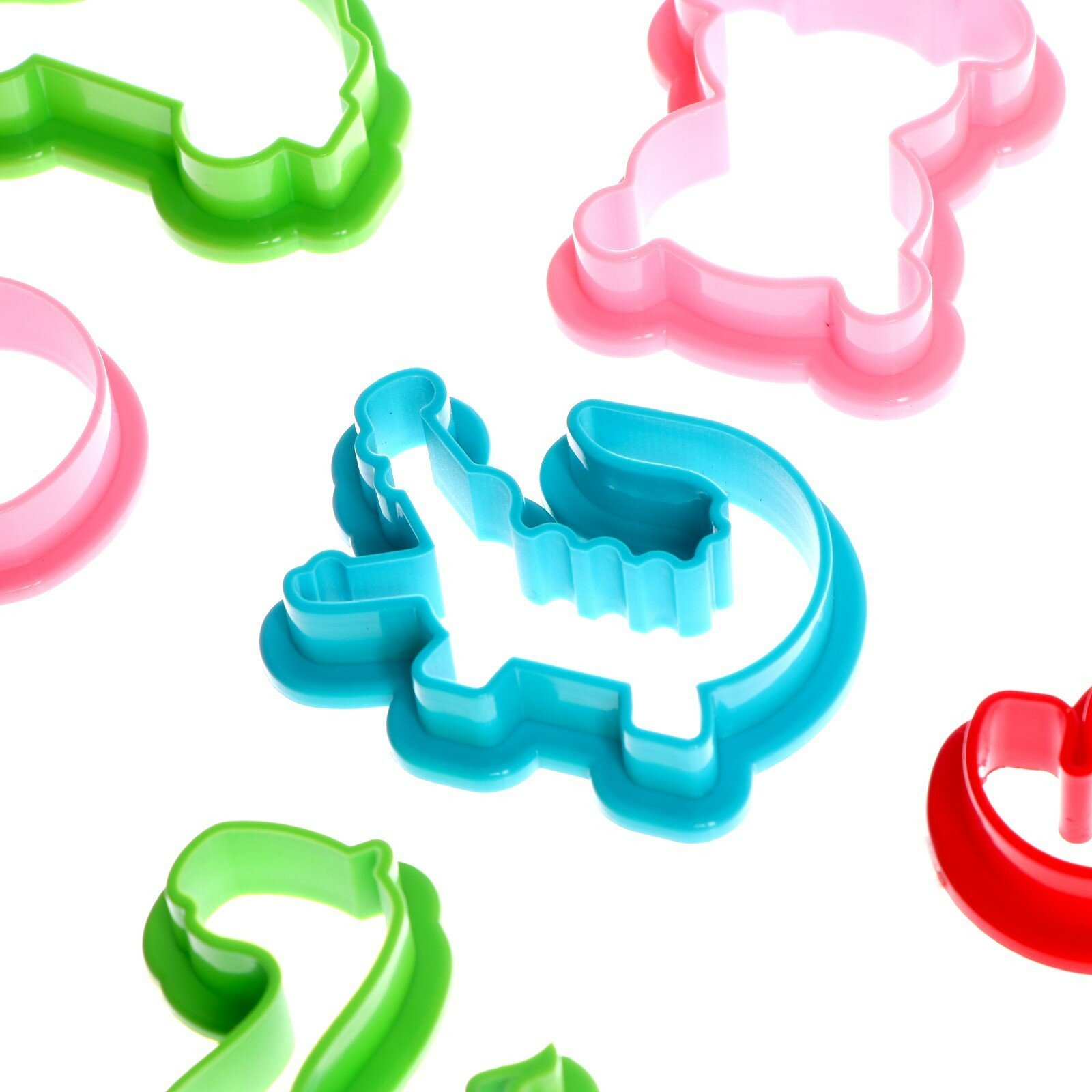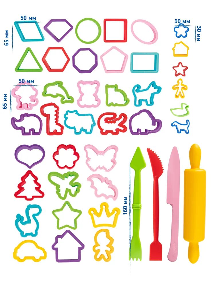 | Состав набора | 32 большие формочки "Зверята", "Предметы и "Фигуры", 6 мини-формочек, 3 стека, скалка. |