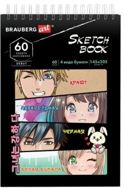 Скетчбук, 4 типа бумаги (акварельная, белая, черная, крафт) 146х204 мм, 60 л., гребень, BRAUBERG ART, аниме, 115066