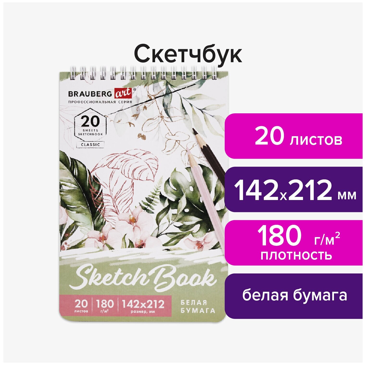 Блокнот-Скетчбук для рисования эскизов белая бумага 180 г/м2, 142х212 мм, 20 л, гребень, твердая обложка, Brauberg Art Classic, 112992