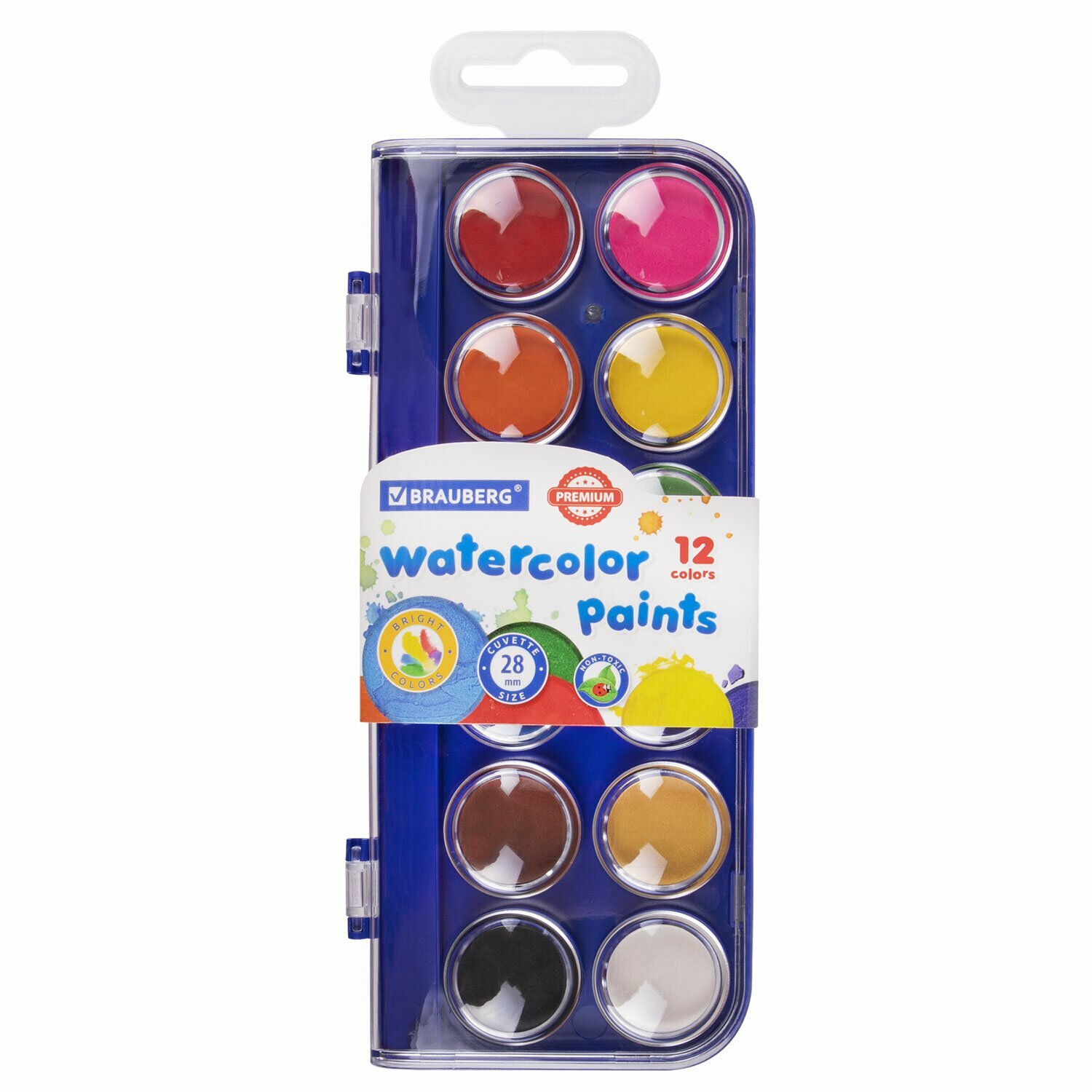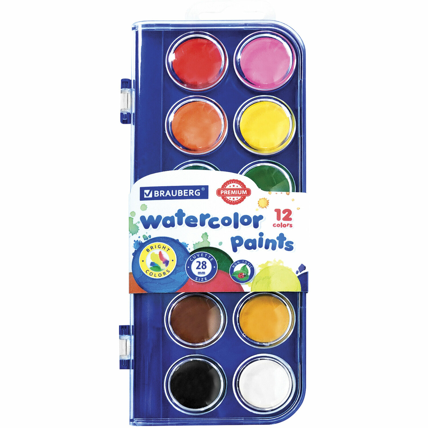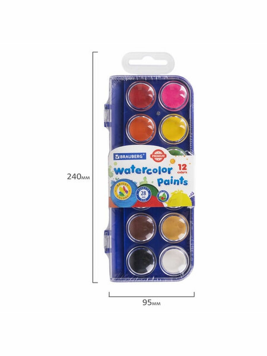Краски акварельные 12 цветов Brauberg Premium, круглые кюветы 28 мм, пенал (191743), 12 уп.