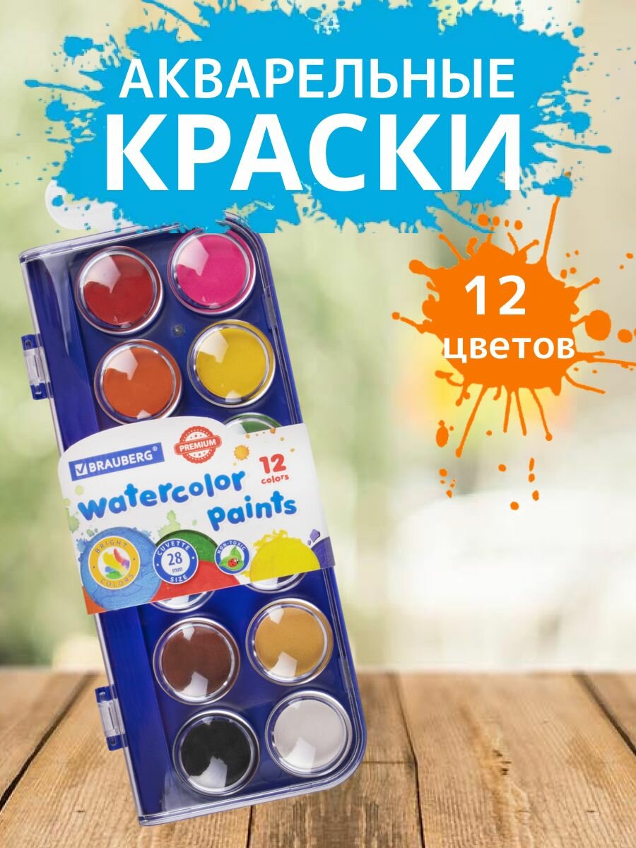 Купить Краски акварельные для рисования сухие Brauberg Premium 12 цветов, круглые кюветы 28мм