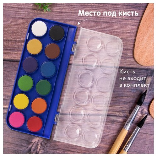 Краски акварельные для рисования сухие Brauberg Premium 12 цветов, круглые кюветы 28 мм, 191743