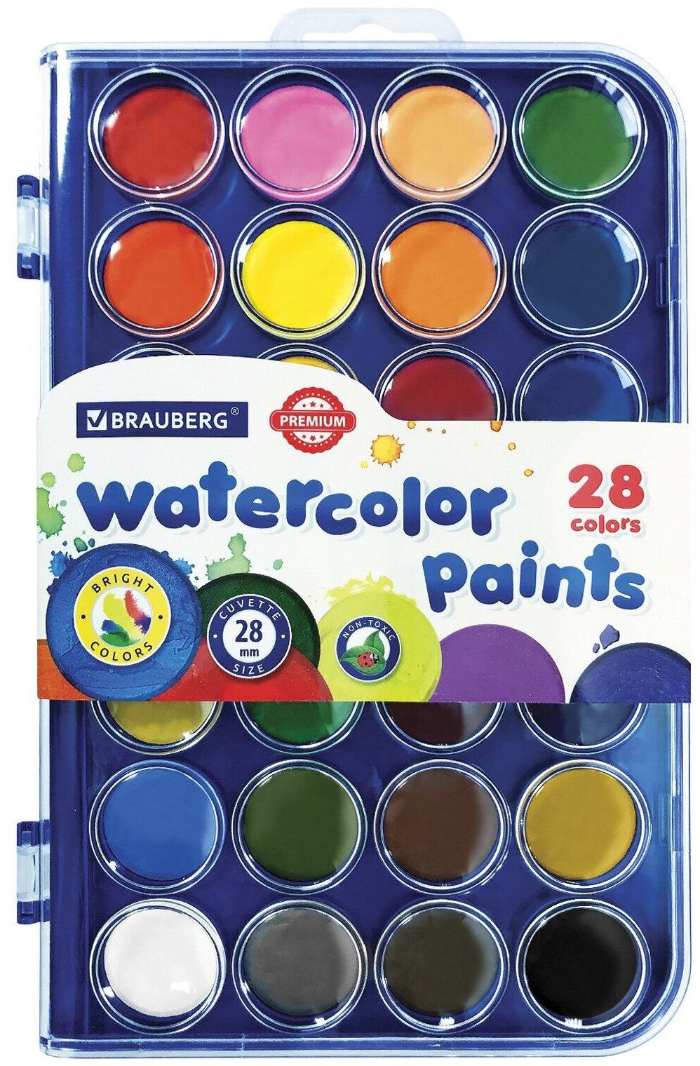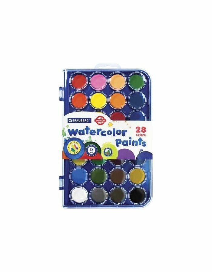 Краски акварельные BRAUBERG "PREMIUM" 28 цветов, круглые кюветы 28 мм, пенал, 191745