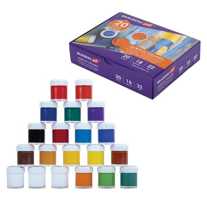 Краски акриловые художественные 24 шт., 22 цвета в банках по 22 мл, Brauberg Hobby, 192412