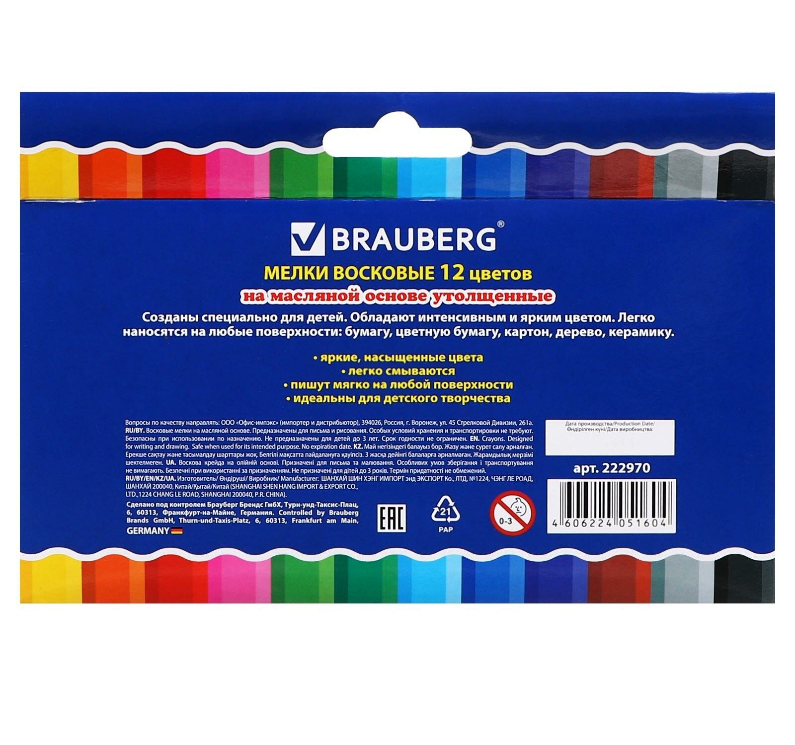 Купить Восковые мелки для рисования утолщенные Brauberg, Набор 12 цветов, на масляной основе, яркие цвета, 222970