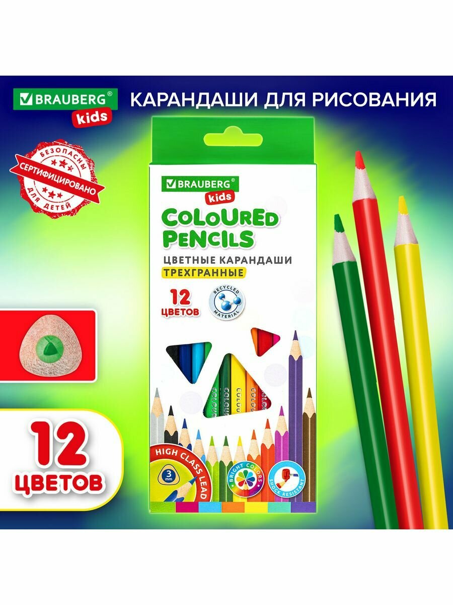 Упаковка 12 шт. Карандаши цветные BRAUBERG KIDS NEW, 12 цветов, трехгранные, грифель 3 мм, 182001