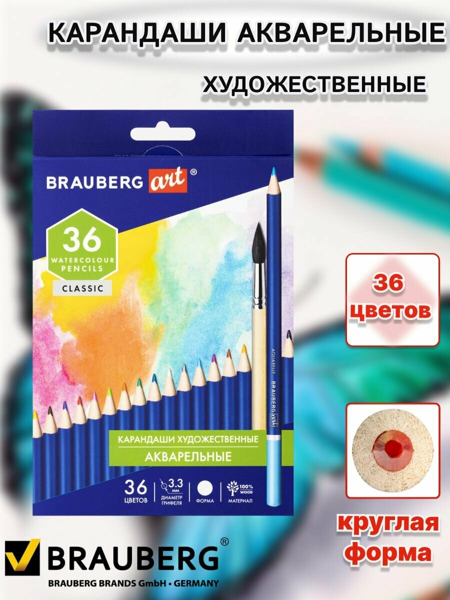 Карандаши цветные акварельные художественные BRAUBERG ART CLASSIC, 36 цветов, грифель 3,3 мм, 181531