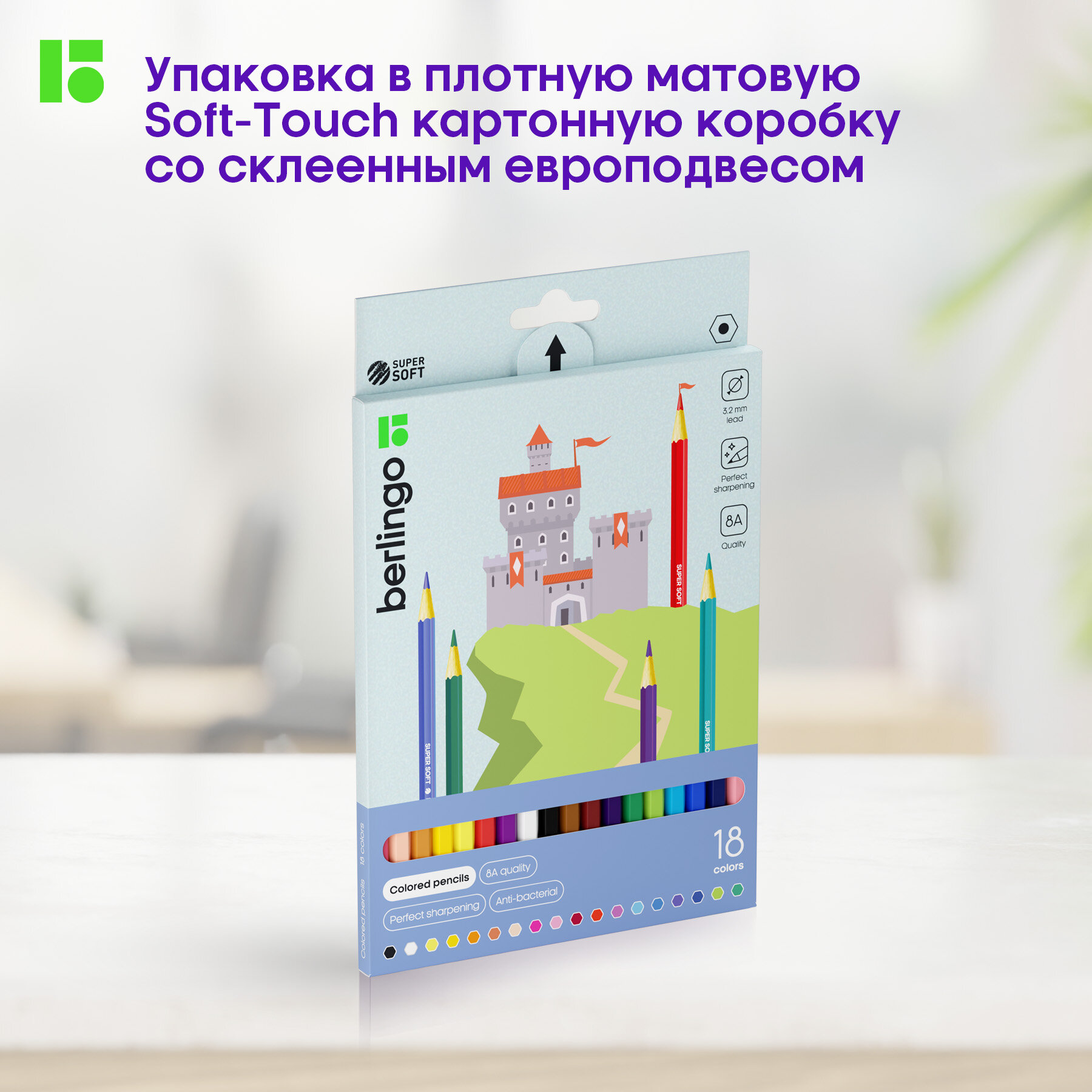 Карандаши цветные 18 цветов Berlingo "SuperSoft. Замки" (L=180мм, D=7мм, d=3.2мм, 6гр) картон, европодвес (SS00118), 8 уп.