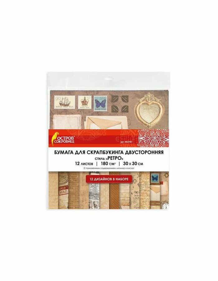 Бумага для скрапбукинга 30х30 см "Ретро", двусторонняя, 12 листов, 12 дизайнов, 180 г/м2, остров сокровищ, 662767