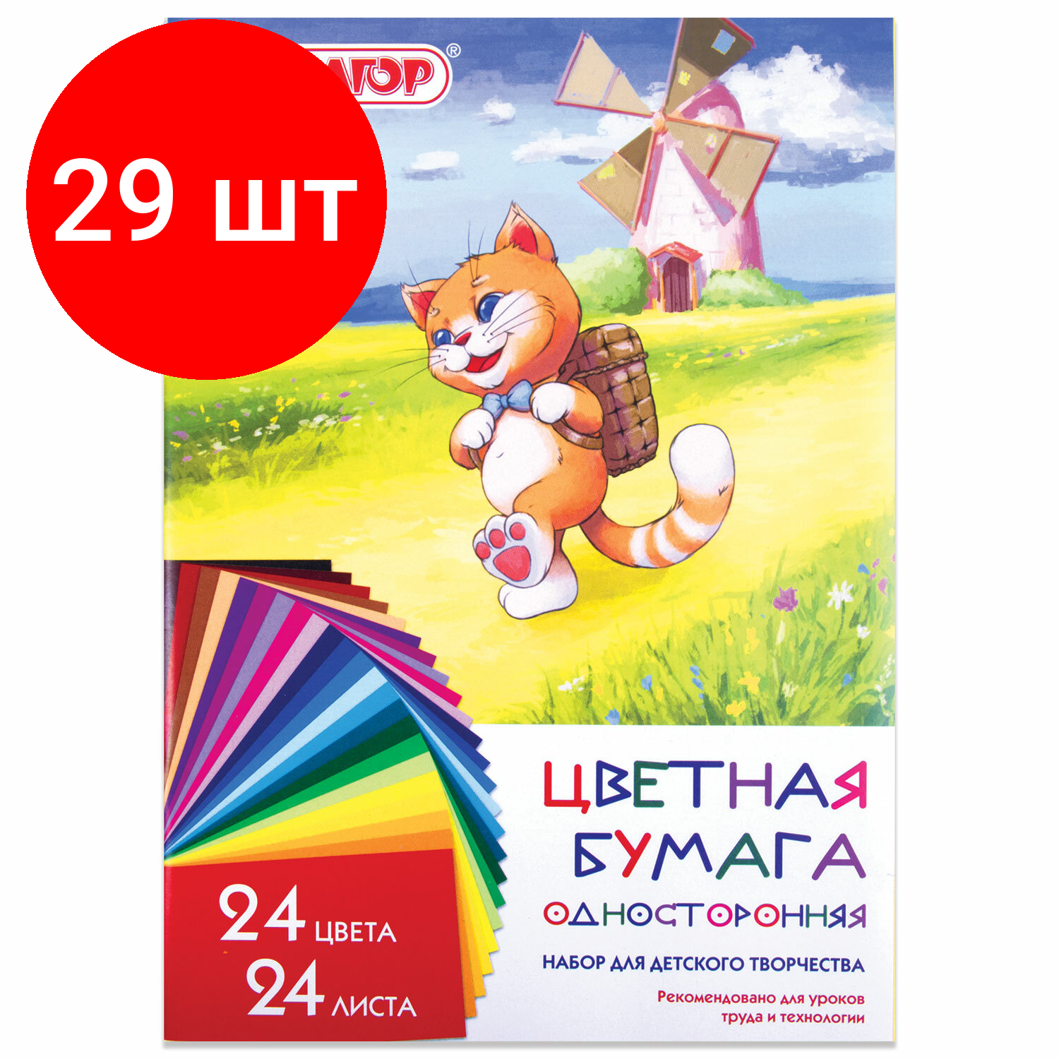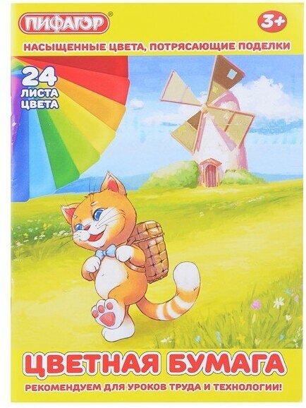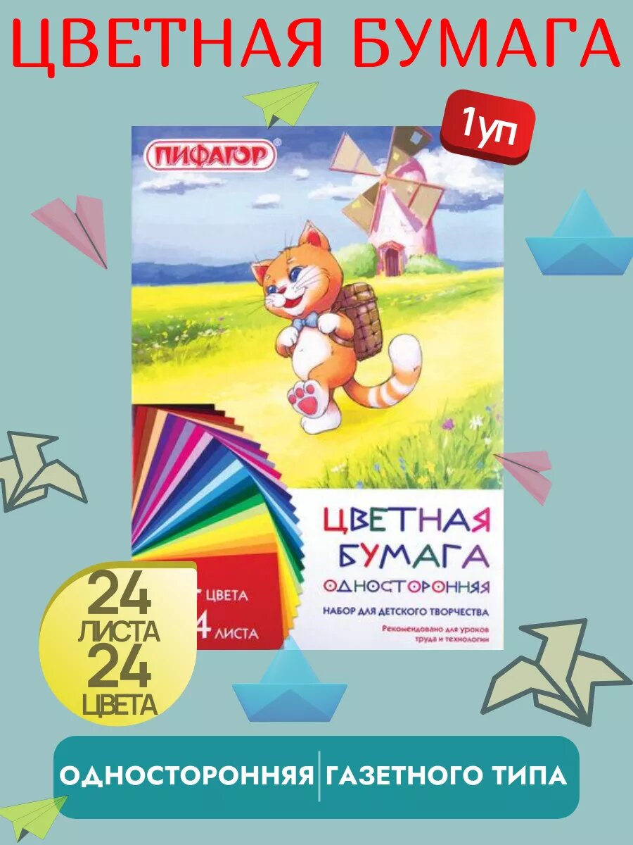 Комплект 146 шт, Цветная бумага А4 газетная, 24 листа 24 цвета, на скобе, пифагор, 200х283 мм, "Умный котик", 128002
