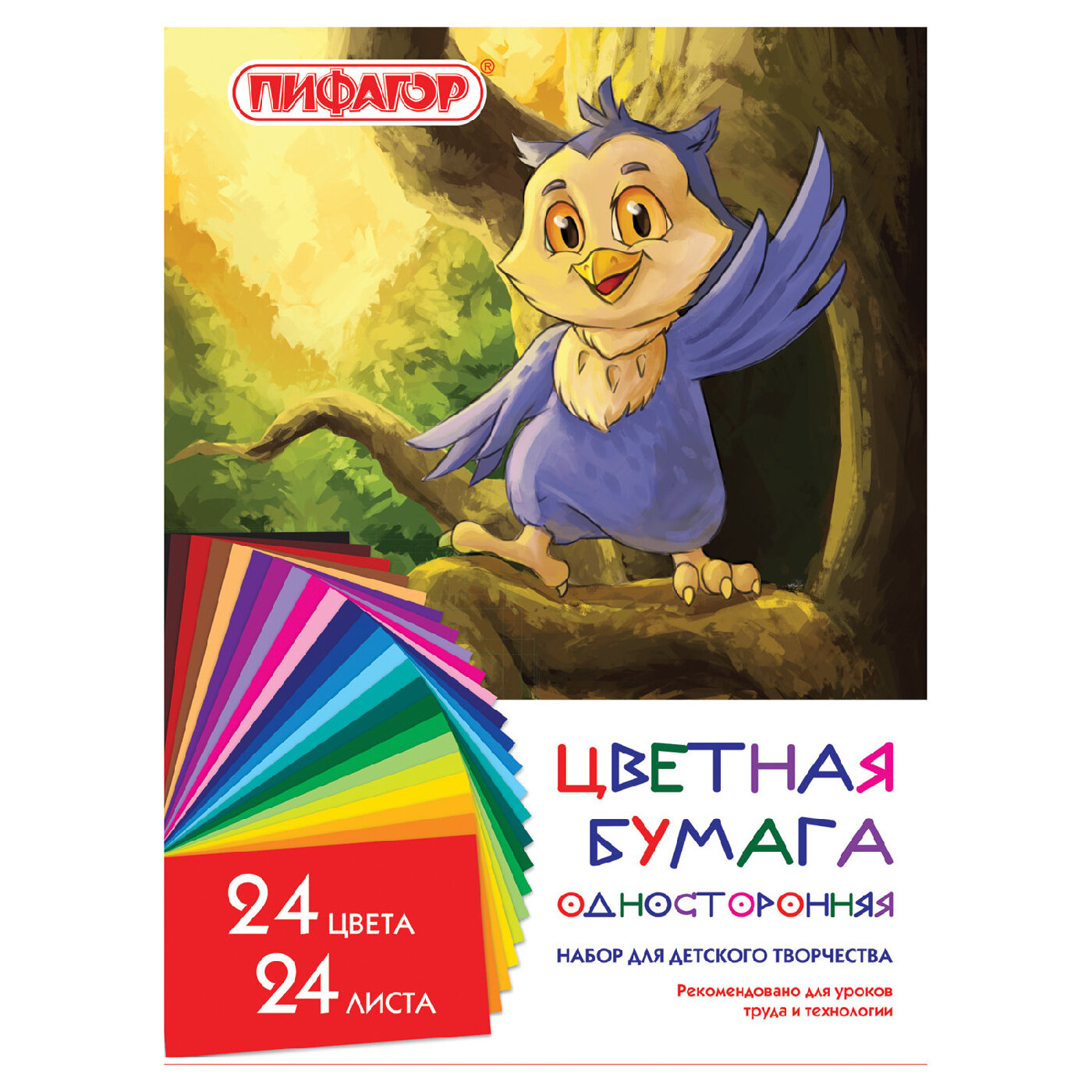 Купить Бумага цветная Пифагор "Совенок" (24 листа, 24 цвета, А4, 200х280мм) (128003)