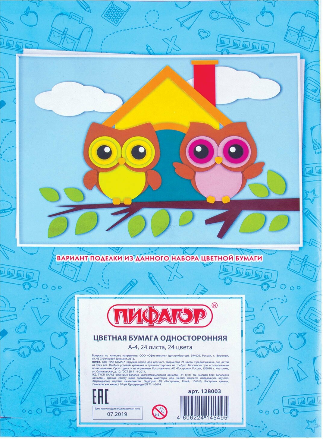 Бумага цветная Пифагор "Совенок" (24 листа, 24 цвета, А4, 200х280мм) (128003), 60 уп.