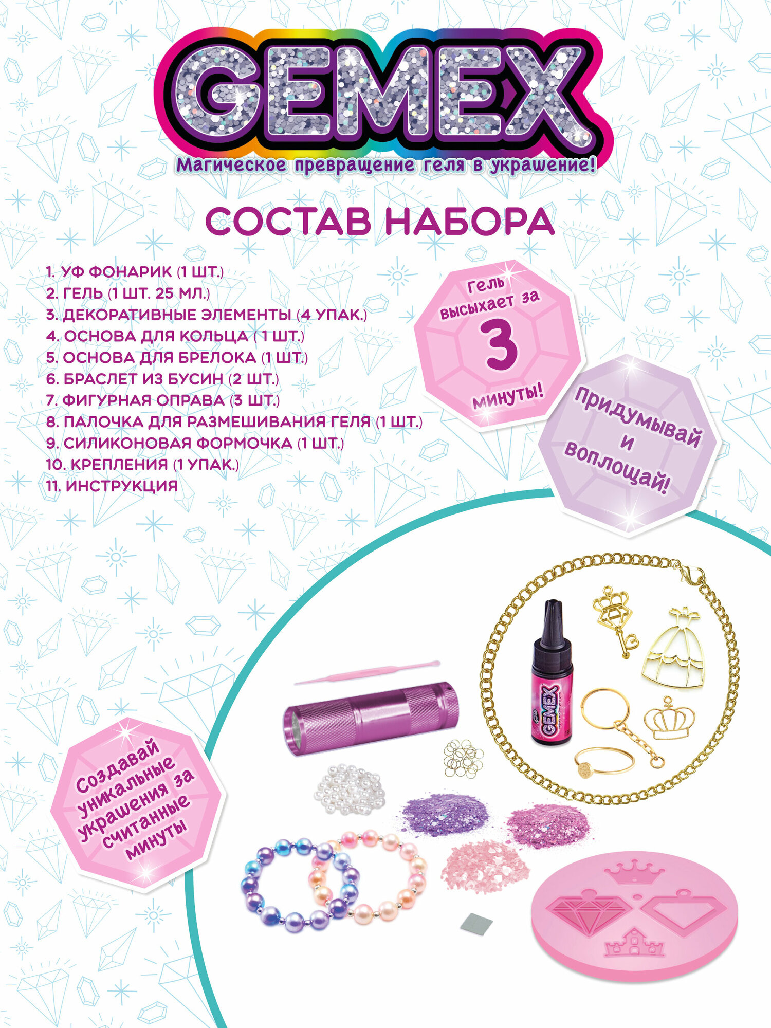 | Комплектация | фонарик УФ (1 шт.), гель 25 мл (1 шт.), декоративные элементы (4 упак.), основа для кольца (1 шт.), основа для брелока (1 шт.), браслет из бусин ( 2 шт.), фигурная оправа ( 3 шт.), палочка для размешивания геля (1 шт), силиконовая формочка (1 шт.), крепления (кольца) (1 упак.), инструкция. |