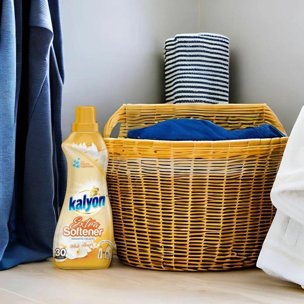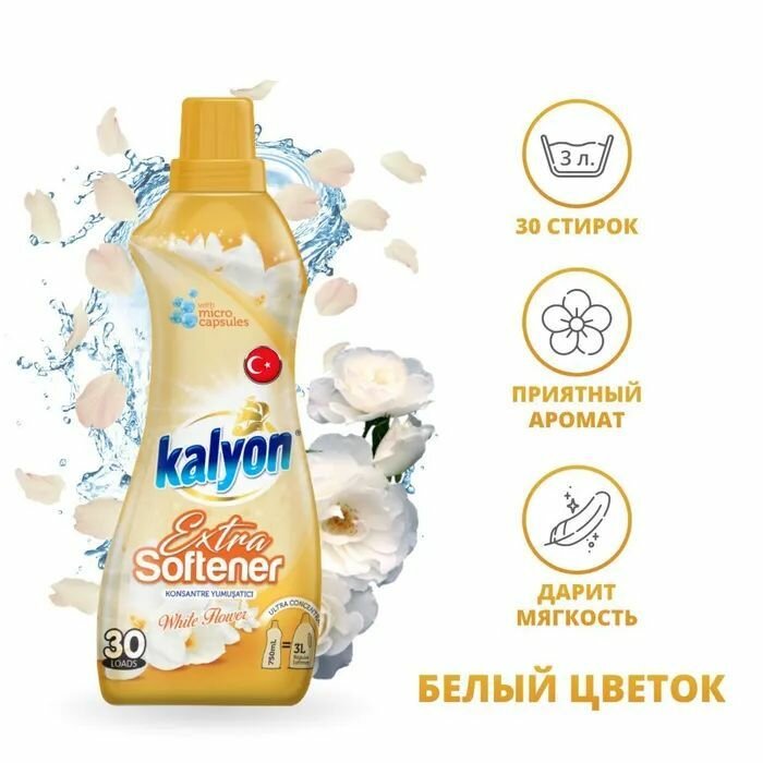 Купить Кондиционер для белья Kalyon средство для стирки концентрированный, гипоаллергенный приятный аромат белый цветок 0.75 литра