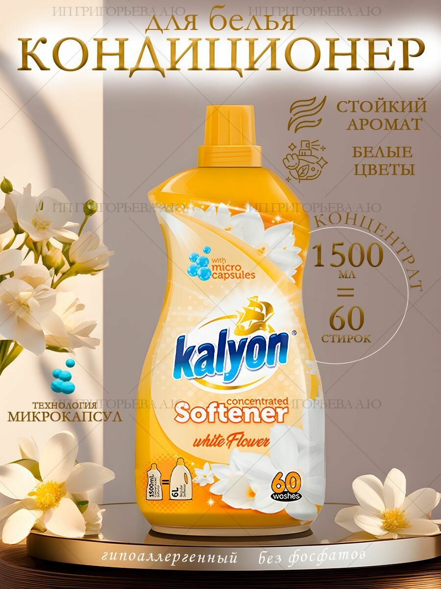 Концентрированный кондиционер ополаскиватель для белья KALYON EXTRA CONCENTRATED SOFTENER Белый Цветок 1500 мл