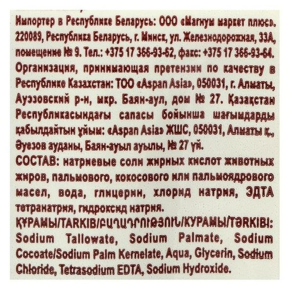| Состав | натриевые соли жирных кислот животных жиров, пальмового, кокосового или пальмоядрового масел, вода, глицерин, хлорид натрия, ЭДТА тетранатрия, гидроксид натрия |