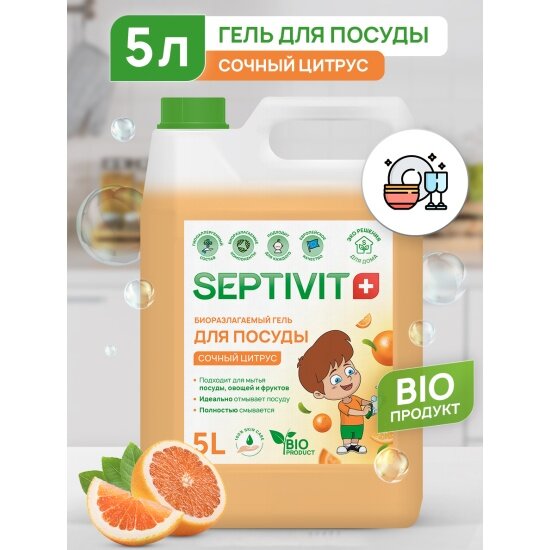 Средство для мытья посуды, овощей и фруктов SEPTIVIT / Гель для мытья посуды Септивит, Сочный цитрус 5л