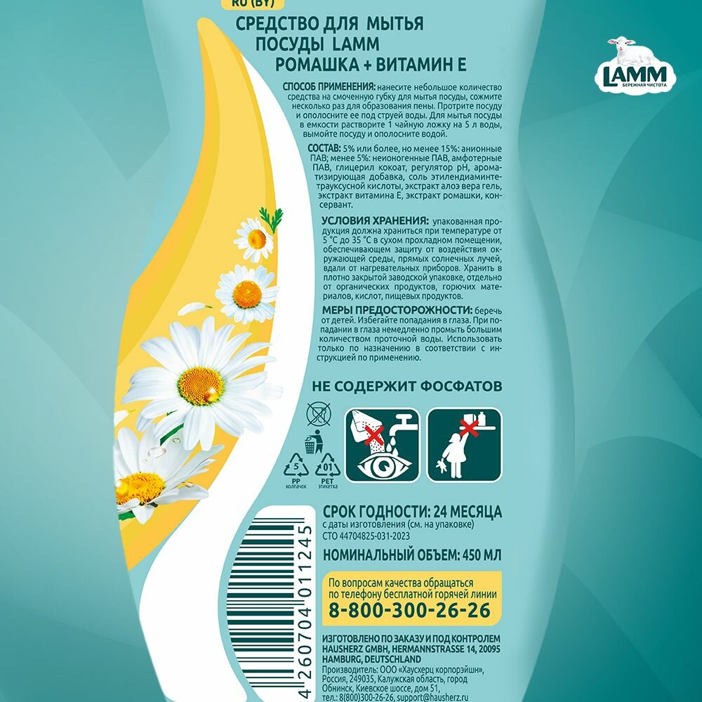 Средство Lamm для мытья посуды Ромашка и витамин Е, 450 мл