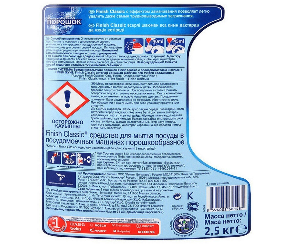 | Комплектация | Порошок Finish Classic 2,5кг для посудомоечных машин |