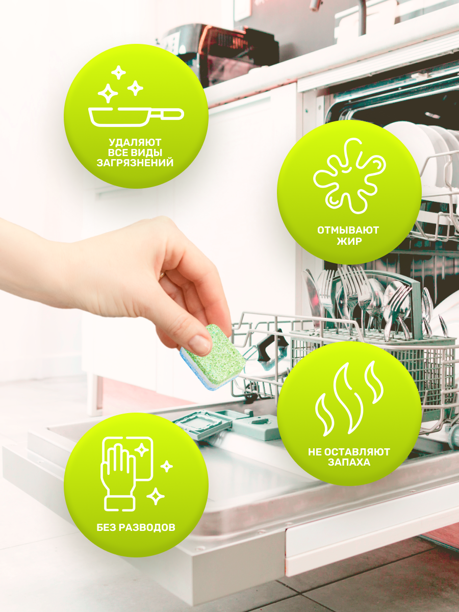 | Способ применения | Снимите защитную пленку и положите таблетку в отсек для моющих средств. Закройте отсек и пользуйтесь машиной как обычно. Для одной мойки достаточно одной таблетки. |