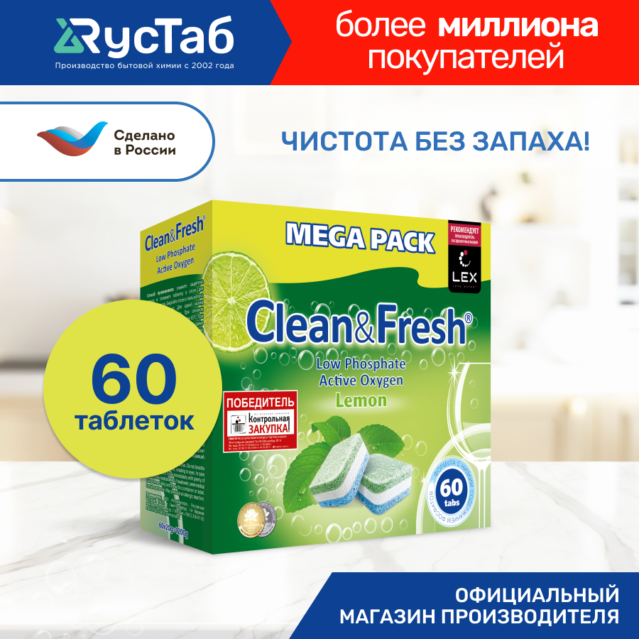 Таблетки для посудомоечной машины "Clean&Fresh" Всё в 1 / 60 шт / капсулы для посудомоечной машины, не растворимая оболочка