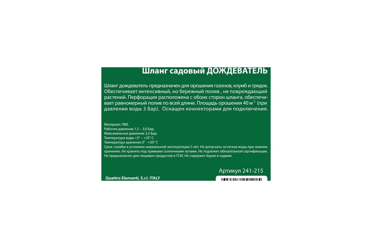 Ниже Вы можете прочитать отзывы на Шланг для воды дождеватель QUATTRO ELEMENTI (15 метров, диаметр 1/2", ПВХ, с фиттингами), ознакомится с подробными характеристиками, посмотреть интересные обзоры и фотографии на Шланг для воды дождеватель QUATTRO ELEMENTI (15 метров, диаметр 1/2", ПВХ, с фиттингами).