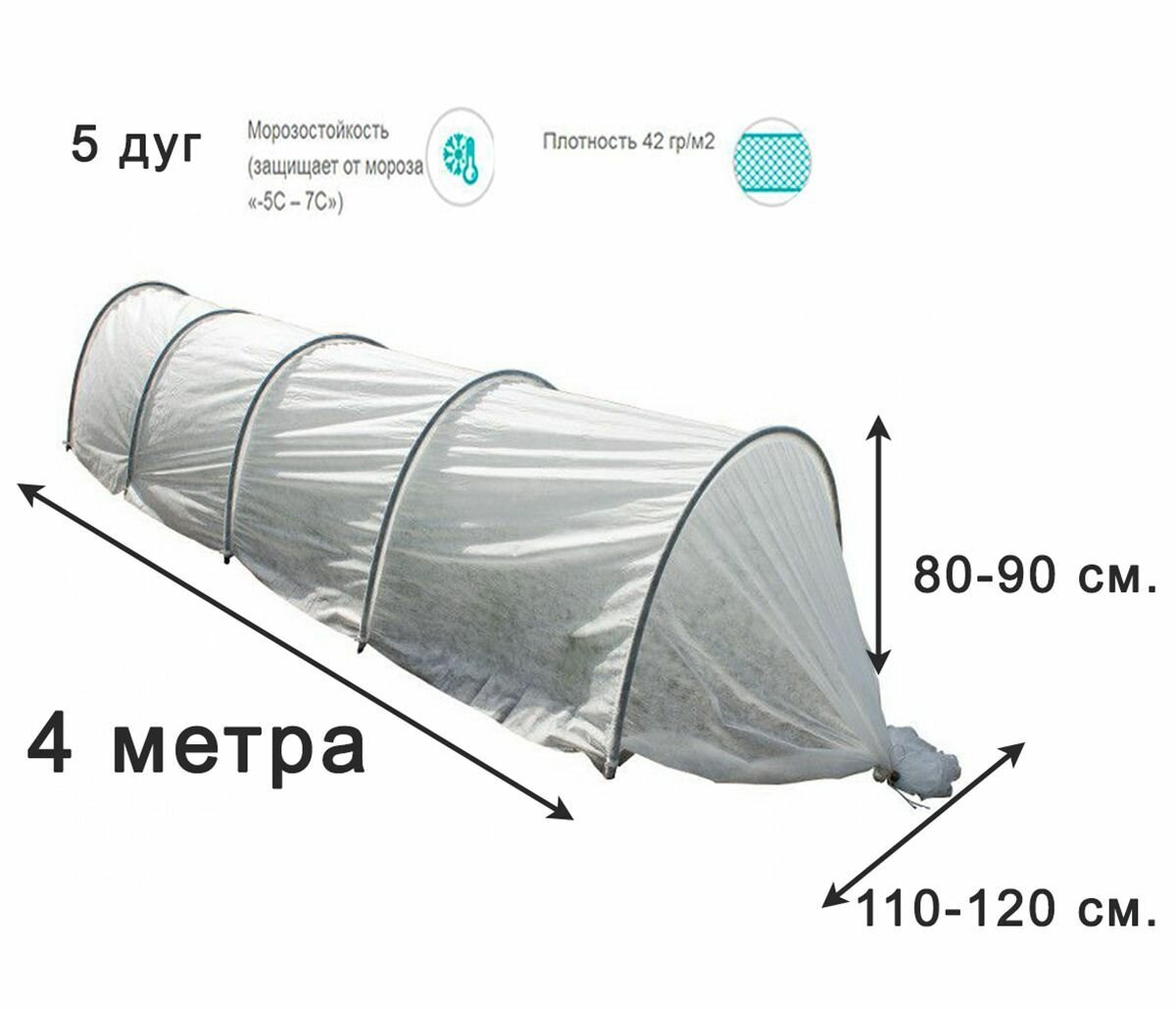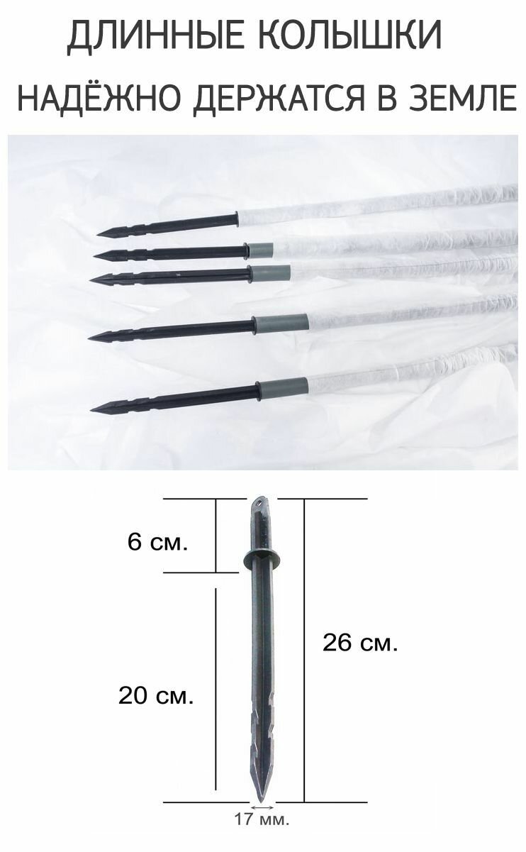 | Комплектация | 1. Дуги: 9 шт. 2. Вшитый укрывной материал. 3. Ножки: 18 шт. 4. Клипсы: 18 шт. 5. Упаковочный пакет. |