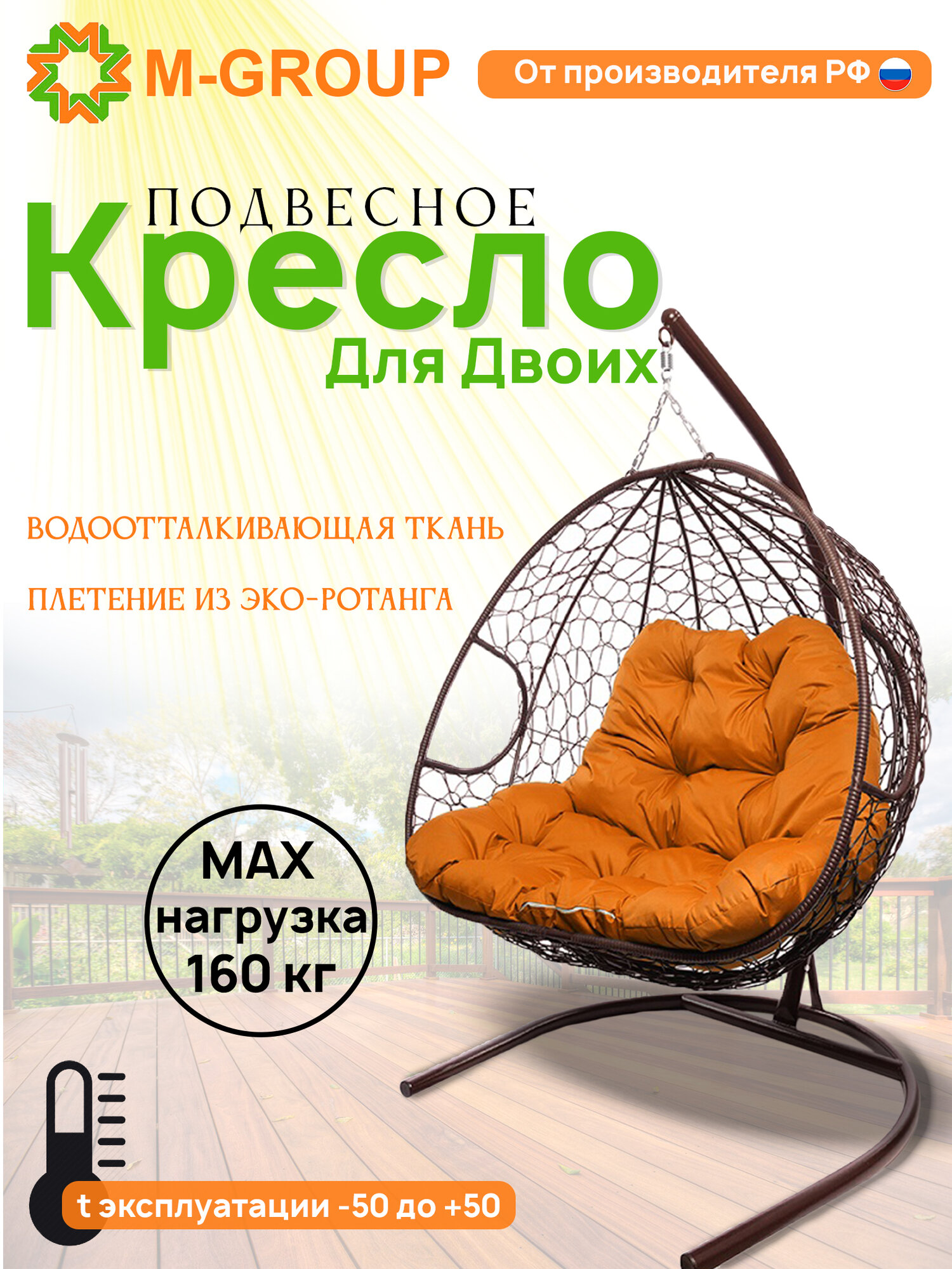 Купить Подвесное кресло из ротанга "Для двоих" коричневое с оранжевой подушкой M-GROUP