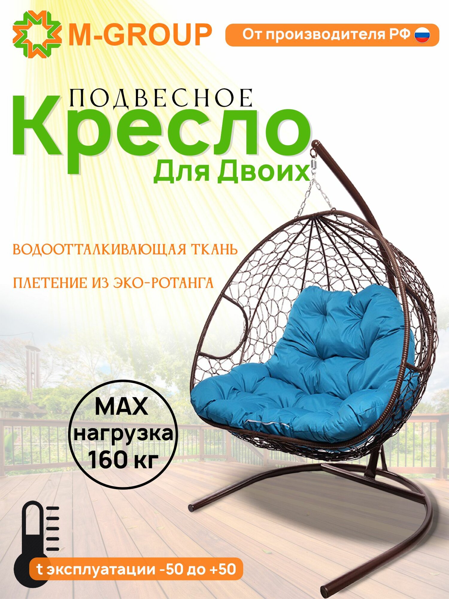 Купить Подвесное кресло из ротанга "Для двоих" коричневое с голубой подушкой M-GROUP