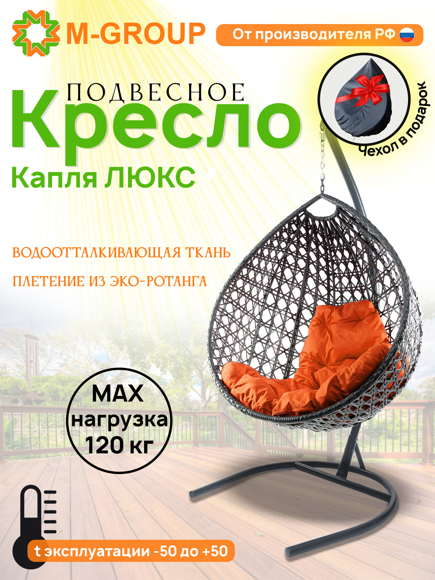 Подвесное кресло M-group капля люкс с ротангом серое оранжевая подушка