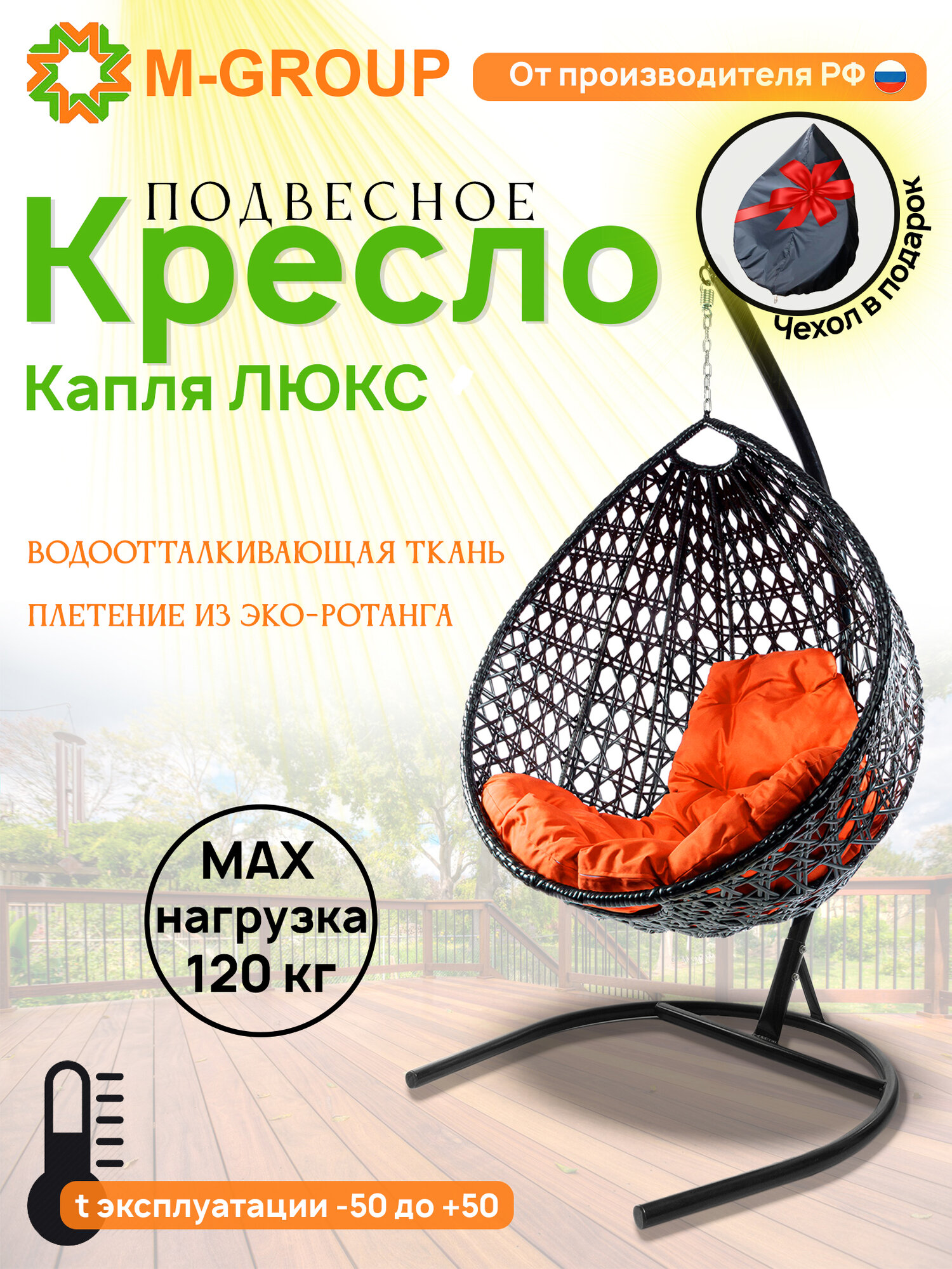 Подвесное кресло M-group капля люкс с ротангом чёрное оранжевая подушка