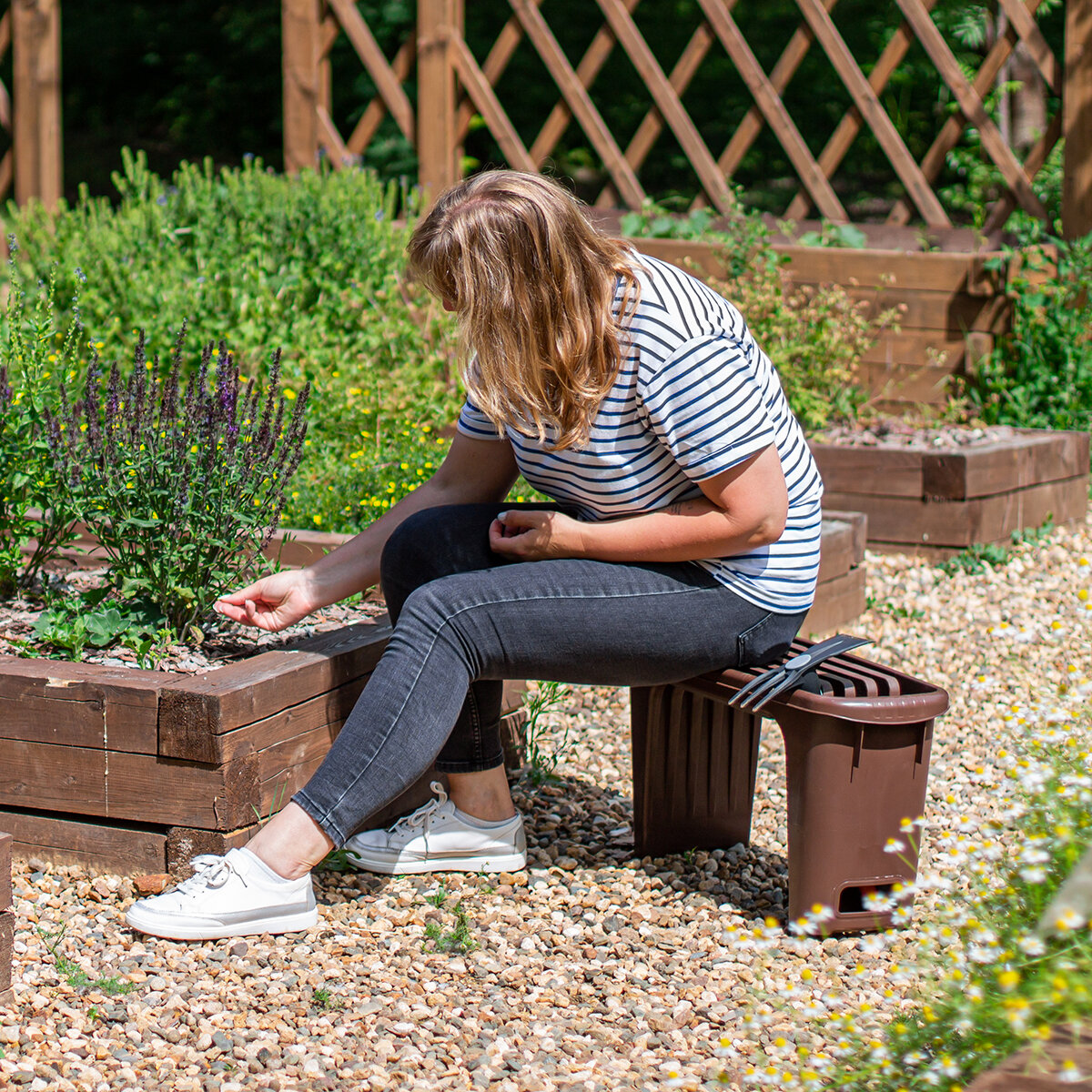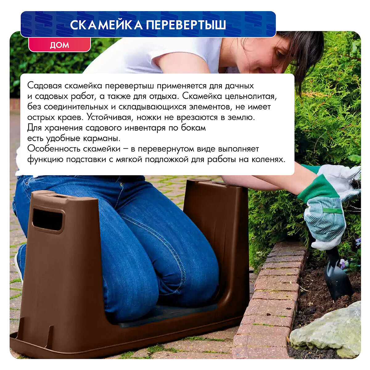| Дополнительная информация | Скамья по бокам имеет карманы, в которых удобно разместить садовый инструмент |