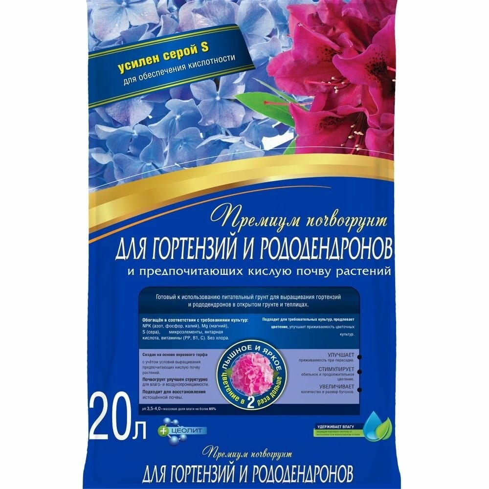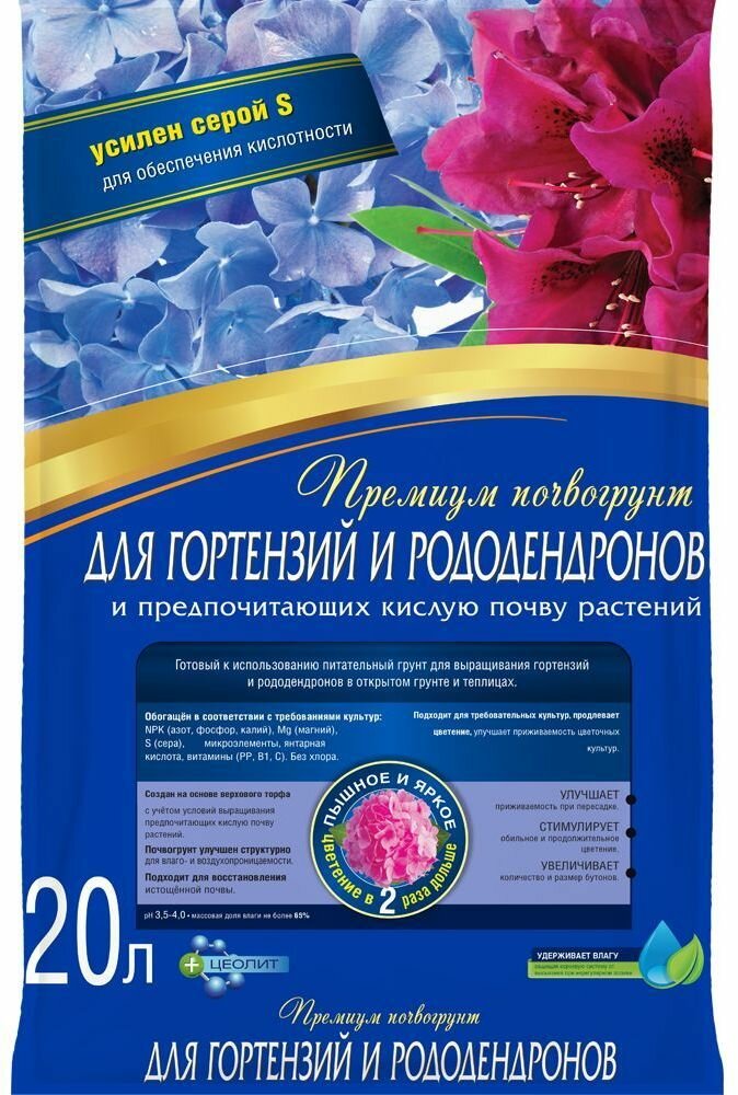 | Состав | Премиум почвогрунт для гортензий и рододендронов и предпочитающих кислую почву растений, 20 л |