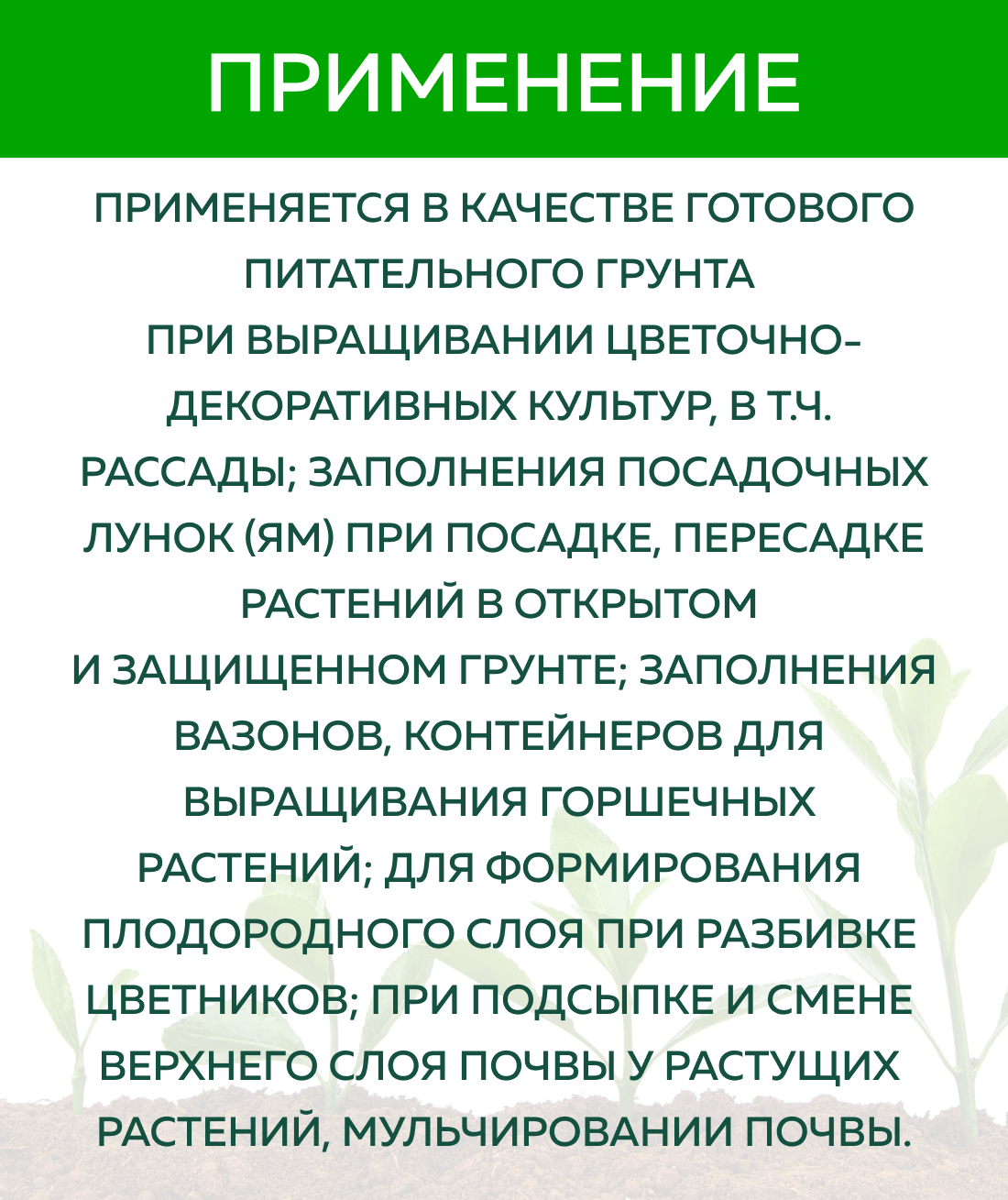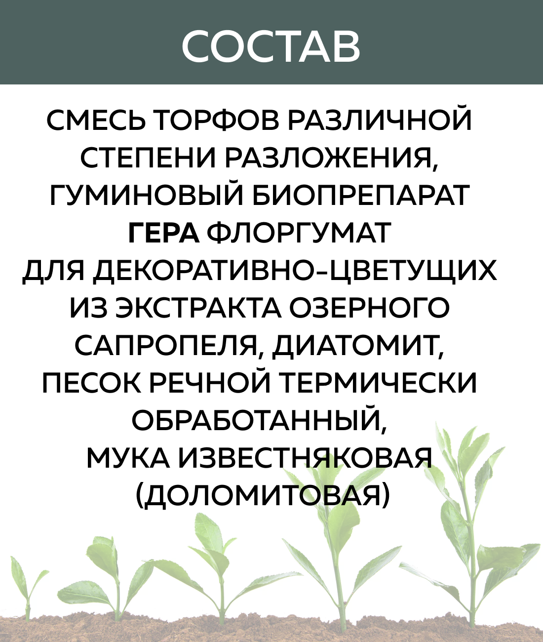 | Состав | смесь торфов различной степени разложения, экстракт сапропеля, песок речной термически обработанный, ГЕРА ФлорГумат, комплексное минеральное удобрение, вермикулит, мука известняковая (доломитовая) |