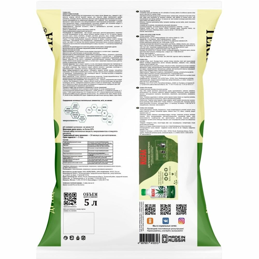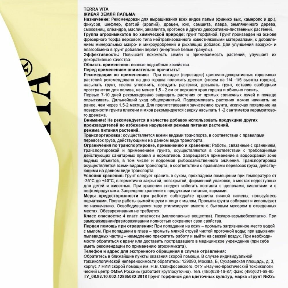 | Состав | Живая земля для Пальм, Фикусов, Драцен Terra vita 5л |
