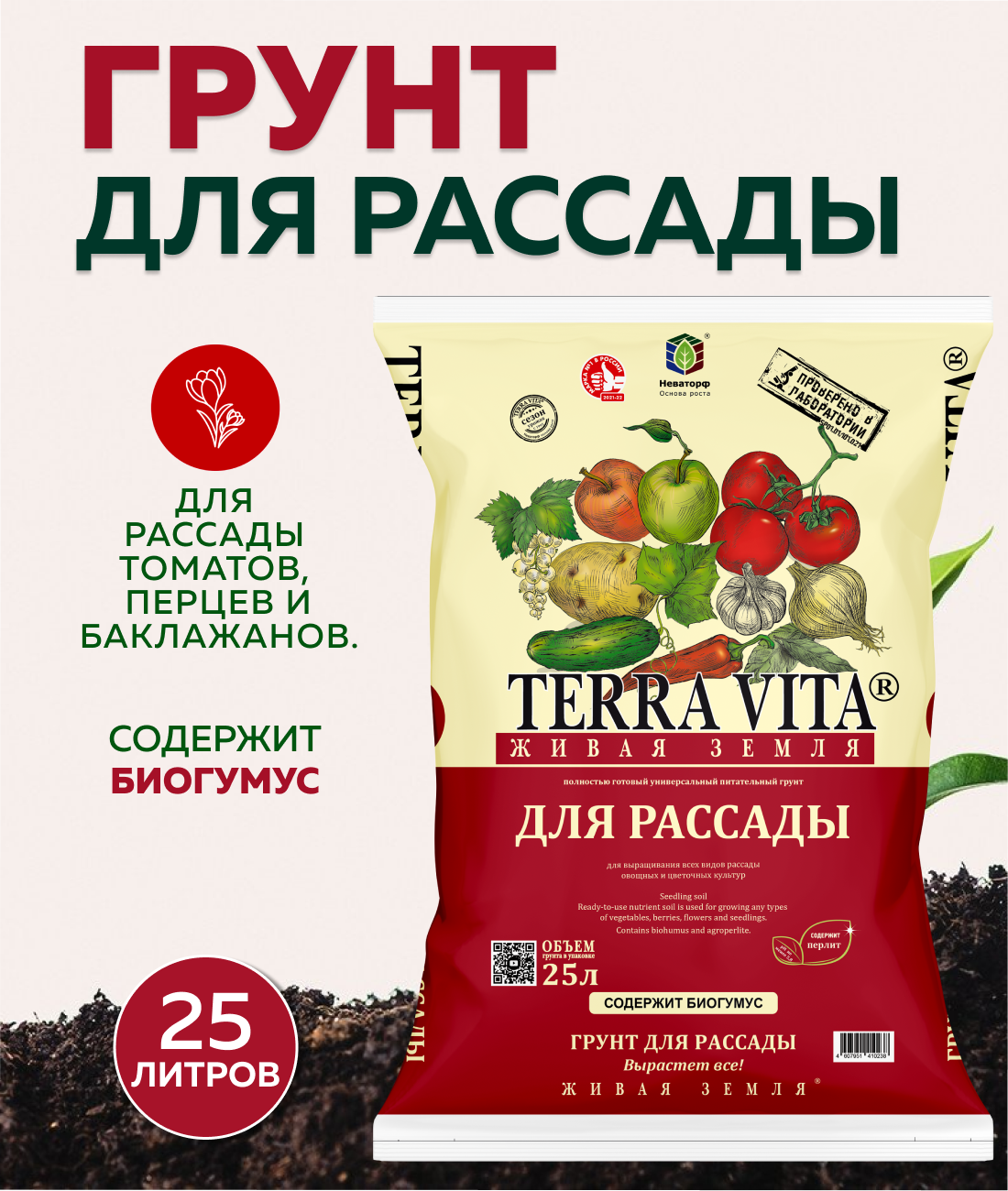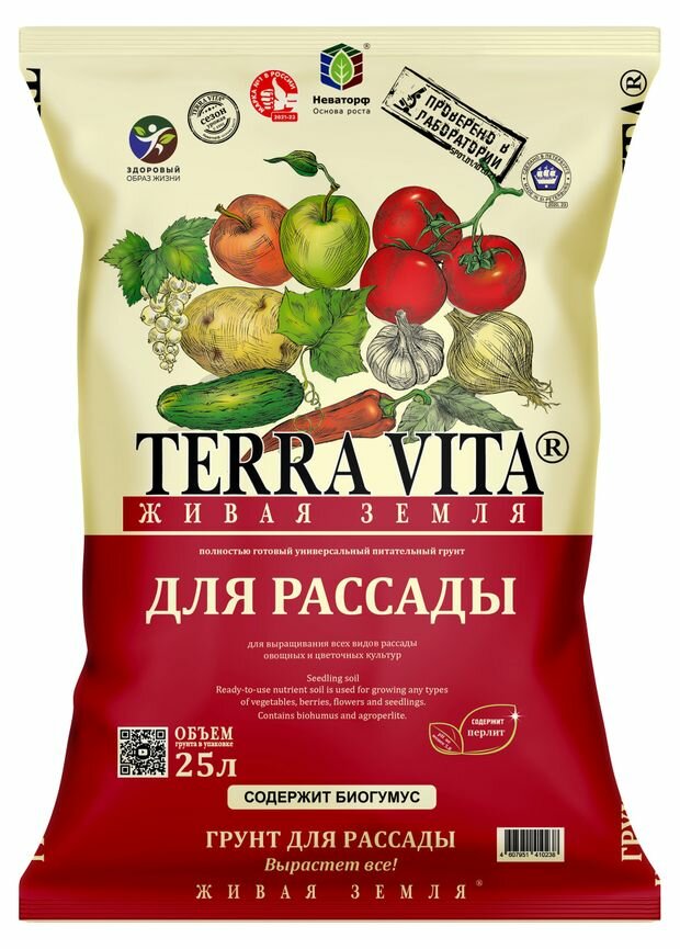 Грунт Terra Vita живая земля для рассады, 25 л, 9 кг