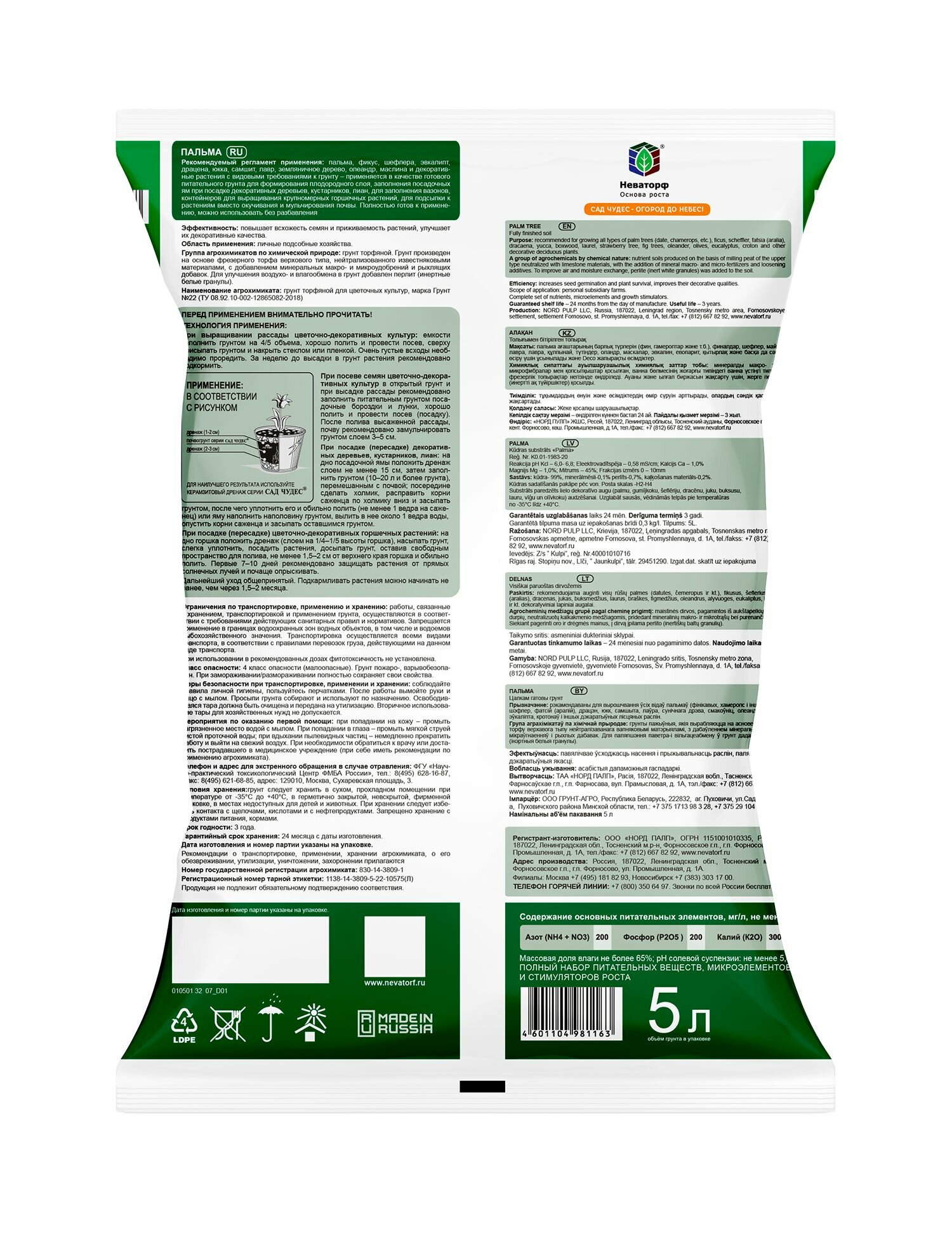 Питательный грунт Пальма 5 л. для пальм (финиковых, хамеропс), фикусов, юкк и других комнатных растений и цветов