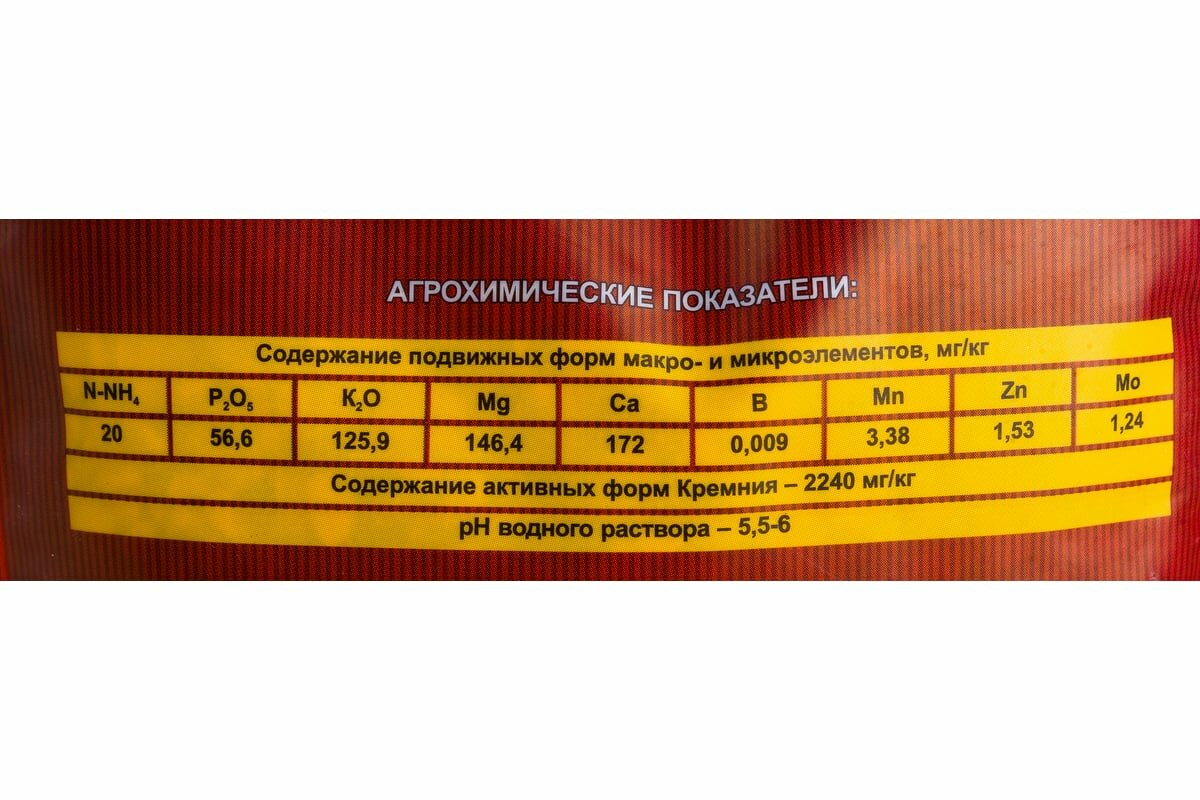 | Основные питательные вещества в мг/л, не менее | pH 5,9, кальций 172, бор 0,009, марганец 3,38, цинк 1,53, активные формы Кремния - 2240 |
