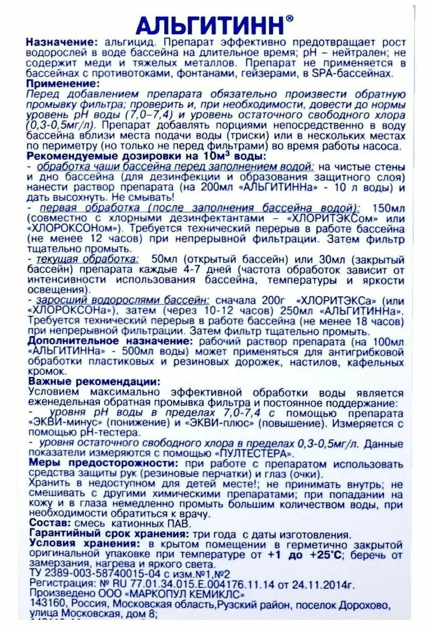 | Дополнительная информация | рекомендуемые дозировки: - текущая обработка: 50мл (открытый бассейн) и 30мл (закрытый бассейн) на 10м3 воды каждые 5-7 дней. - «ударная» обработка: 150мл на 10м3 воды – по мере необходимости. Требуется технический перерыв в работе бассейна не менее 12 часов; заросший водорослями бассейн: на 10м³ воды - сначала 10таблеток ХЛОРИТЭКСа , затем (лучше - через 10-12 часов) 250мл АЛЬГИТИННа |