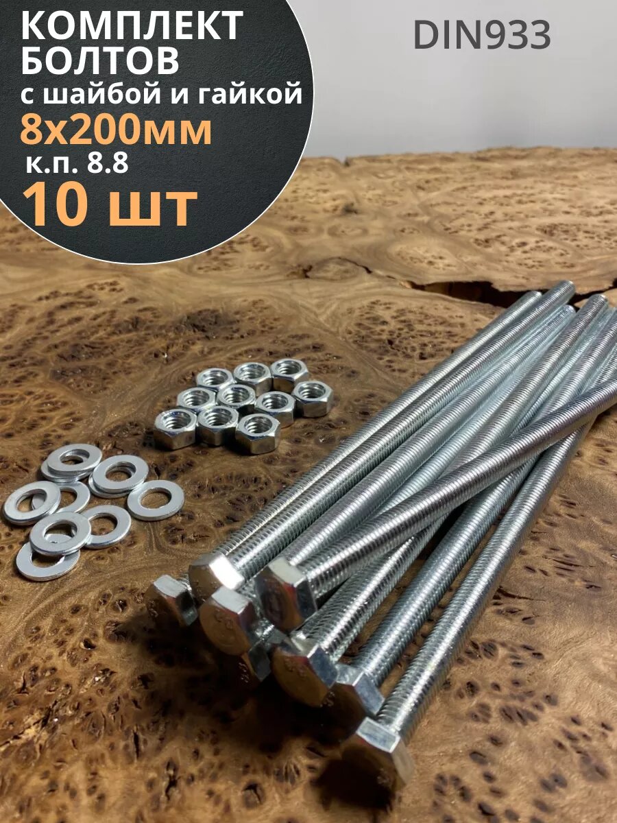 Купить Болт 8х200 мм с гайкой и шайбой ОЦ DIN933 к.п.8.8 (10 шт.)