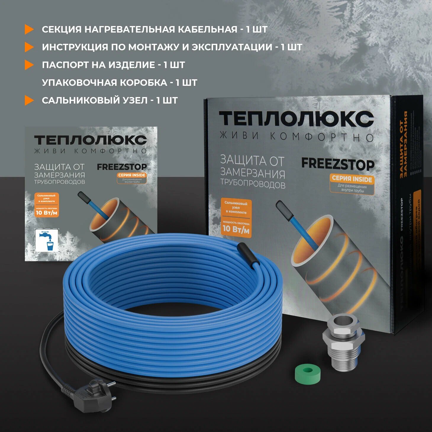 Комплект греющего кабеля в трубу FreezStop inside с сальником 10 вт/м 2 метра