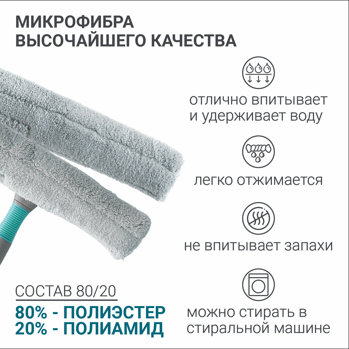 | Комплектация | Рабочая часть состоит из резинового скребка для сгона воды и насадки из микрофибры, которая крепится посредством ленты велкро |