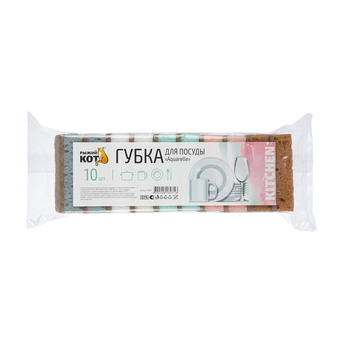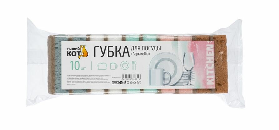 Губки для мытья посуды "Рыжий Кот" Aquarelle, 10 штук, 9.3 x 6.5 x 2.7 см