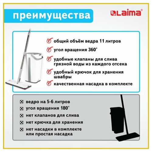Швабра с отжимом и двухкамерным ведром 11 л/9 л, насадка Моп, набор для уборки Laima Pro Clean, 607979