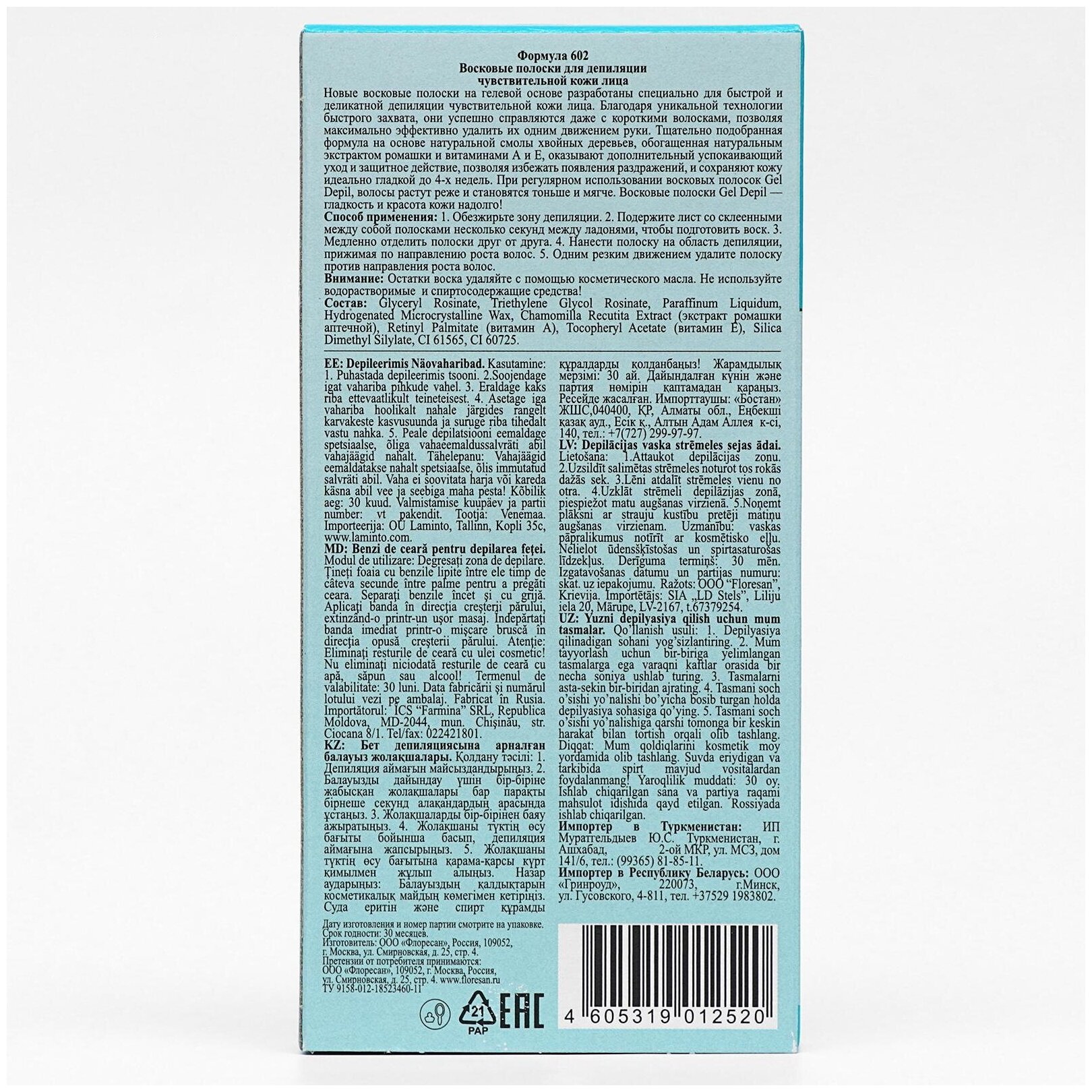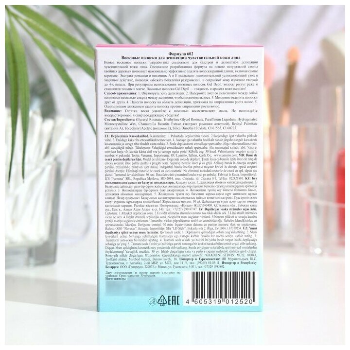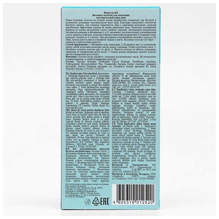 | Способ применения | обезжирьте зону депиляции; подержите лист со склеенными между собой полосками несколько секунд между ладонями, чтобы подготовить воск; медленно отделить полоски друг от друга; нанести полоску на область депиляции, прижимая по направлению роста волос; одним резким движением удалите полоску против направления роста волос |