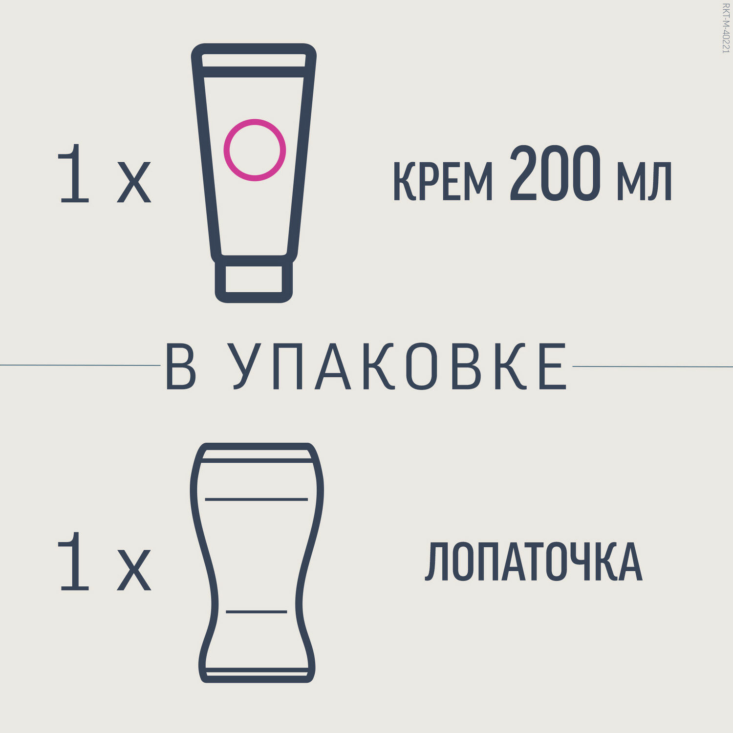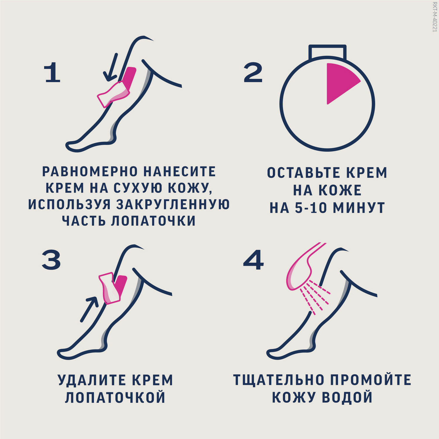 | Способ применения | нанесите крем на кожу и равномерно распределите его закругленной частью лопатки, чтобы он полностью покрыл волос. Оставьте крем на коже на 5 минут, а затем осторожно очистите небольшой участок лопаткой. Если волосы легко удаляются, широким или узким концом лопатки (в зависимости от части тела) уберите оставшийся крем. Если необходимо, оставьте крем на коже еще на несколько минут, но не более чем на 10 минут в целом. Тщательно промойте кожу водой после окончания процедуры и вытрите насухо |