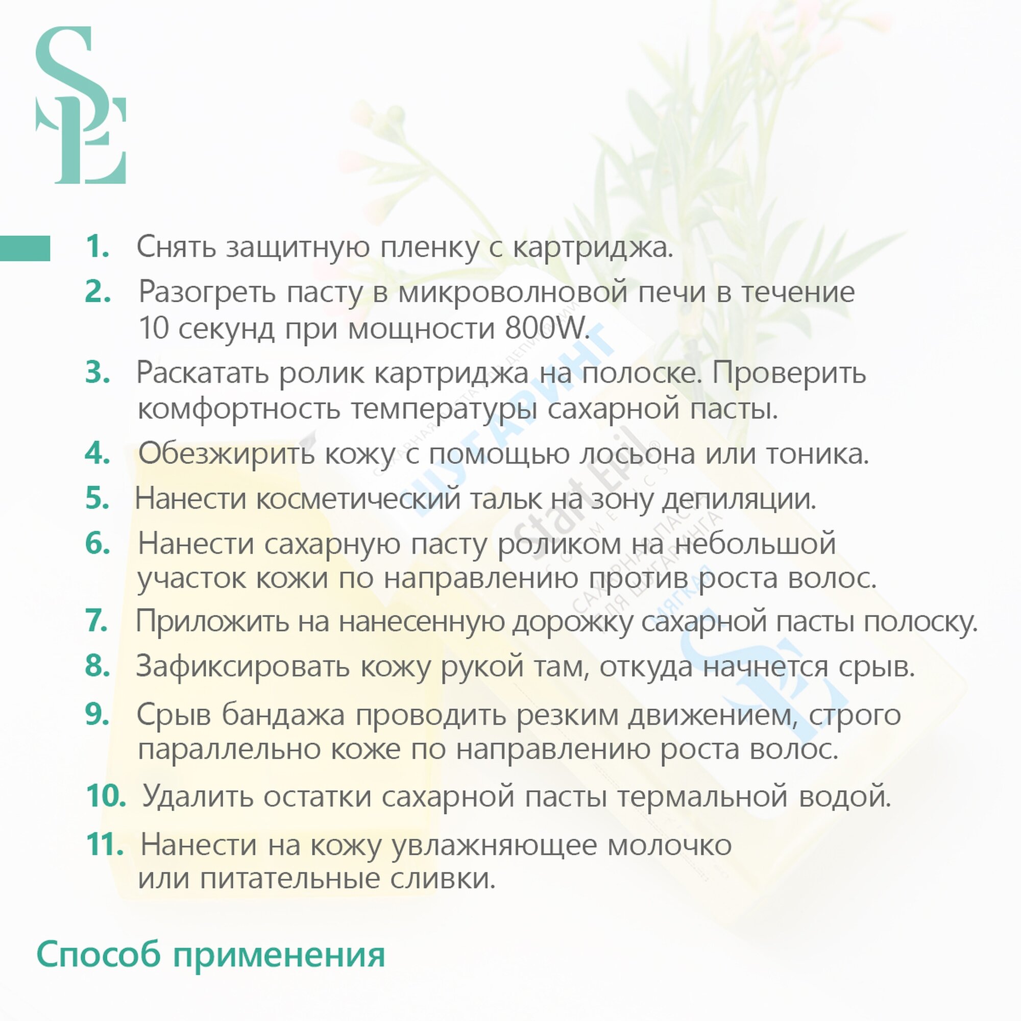 | Способ применения | снимите защитную пленку с картриджа. Разогрейте пасту в микроволновой печи в течение 10 секунд при мощности 800w. Раскатайте ролик картриджа на полоске. Проверьте комфортность температуры сахарной пасты. Обезжирьте кожу с помощью лосьона или тоника. Нанесите косметический тальк на зону депиляции. Нанесите сахарную пасту роликом на небольшой участок кожи по направлению против роста волос. Приложите на нанесенную дорожку сахарной пасты полоску. прижать для более крепкого сцепления. Зафиксируйте кожу рукой там, откуда начнется срыв. Срыв бандажа проводите резким движением, строго параллельно коже по направлению роста волос. Удалите остатки сахарной пасты термальной водой. Нанесите на кожу увлажняющее молочко или питательные сливки. Для повышения эффективности проведения процедуры депиляции на всех этапах рекомендуется использовать линейку средства start epil® |
