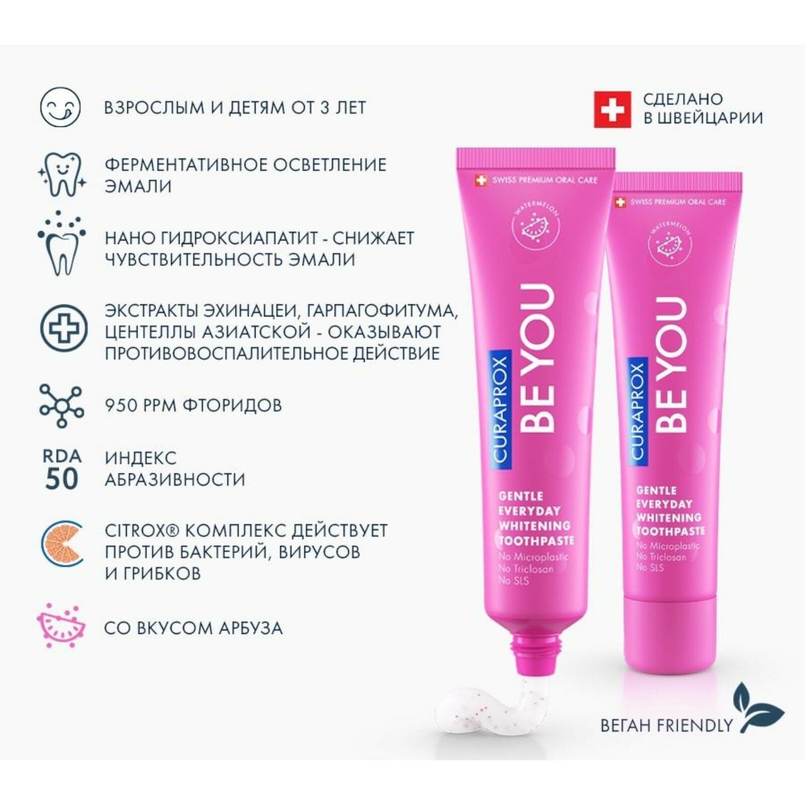 | Не содержит | искусственные ароматизаторы / искусственные подсластители / консерванты / красители / лаурилсульфат натрия (SLS) / ментол / мяту / парабены / триклозан / фтор / хлоргексидин |